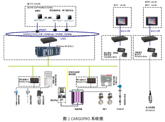 【摘 要】作為全船檢測(cè)報(bào)警系統(tǒng)中最重要的子系統(tǒng)之一,我們的貨控系統(tǒng)全部基于 GE 的控制產(chǎn)品,采用先進(jìn)的模塊化打包設(shè)計(jì)。該系統(tǒng)一方面可以單獨(dú)運(yùn)行,另一方面可以與別的系統(tǒng)實(shí)現(xiàn)無(wú)縫連接。 1. 系統(tǒng)概述 CARGOPRO系統(tǒng)主要有四個(gè)相對(duì)獨(dú)立的子系統(tǒng)組成,包括:液位遙測(cè)系統(tǒng)、閥門(mén)遙控系統(tǒng)、獨(dú)立高位及高高位報(bào)警系統(tǒng)和大艙進(jìn)水報(bào)警系統(tǒng),能對(duì)全船的貨控系統(tǒng)進(jìn)行監(jiān)測(cè)及報(bào)警,是全船電氣系統(tǒng)的重要組成部分。該系統(tǒng)有大量數(shù)字量和模擬量的測(cè)量點(diǎn),且這些測(cè)量點(diǎn)種類(lèi)多,分布廣,因此對(duì)系統(tǒng)的安全性,可靠性及通信能力有較高的要求。我們采用GE Fanuc 90-30、VersaMax Micro等系列的PLC作為系統(tǒng)的控制單元,VersaMax Remote I/O作為遠(yuǎn)程站進(jìn)行信號(hào)采集,Genius Bus、Mod Bus、Profibus等通用總線協(xié)議作為內(nèi)部通信協(xié)議,并通過(guò)TCP/IP網(wǎng)絡(luò)協(xié)議與工控軟件iFix通信,實(shí)現(xiàn)人機(jī)對(duì)話。 2. 系統(tǒng)解決方案 整套 CARGOPRO 系統(tǒng)的系統(tǒng)圖如圖 1所示: