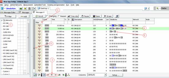 1)、圖3中①所在的部分是濾波器,因?yàn)関spy可以同時(shí)監(jiān)控多種網(wǎng)絡(luò)數(shù)據(jù),該濾波器基于網(wǎng)絡(luò)類型濾波,例如,勾選HSCAN,則監(jiān)控界面將只顯示HSCAN類型網(wǎng)絡(luò)數(shù)據(jù)。
