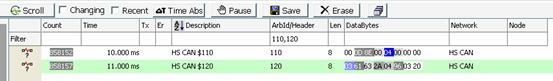 2)、圖3中②所指的欄為濾波欄,在該欄中可以更靈活實(shí)現(xiàn)濾波功能,如根據(jù)報(bào)文名稱,ArbID等濾波,支持“?”“*”等符號(hào),比如現(xiàn)在我們只想監(jiān)控Arb ID為110和120的報(bào)文,則只需要在ArbID欄輸入110,120則可,如圖4所示: