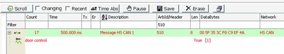 通過以上的介紹,相信有經(jīng)驗(yàn)的工程師已經(jīng)看出這款產(chǎn)品在總線數(shù)據(jù)解碼方面的優(yōu)越性。對(duì)于車載CAN總線,由于CAN報(bào)文的優(yōu)先級(jí)取決于ArbID,ID值越小,優(yōu)先級(jí)越高,這為我們揣測(cè)報(bào)文是來自于車載上的哪個(gè)ECU提供了依據(jù),由于vspy可以實(shí)時(shí)無遺漏地監(jiān)視總線通信報(bào)文變化并能以各種顏色來區(qū)分?jǐn)?shù)據(jù)變化的快慢,因此我們可以通過反復(fù)動(dòng)作車輛來觀察報(bào)文變化情況,如開關(guān)車門,開和關(guān)會(huì)引起某個(gè)數(shù)據(jù)字節(jié)中的某位產(chǎn)生狀態(tài)變化,由于這種變化是非連續(xù)性的快速變化數(shù)據(jù),在監(jiān)控界面中必然會(huì)以藍(lán)色背景顯示,因此我們可以在開關(guān)車門的時(shí)候在監(jiān)控界面查找有藍(lán)色變化的報(bào)文,并將這些報(bào)文用上述的濾波功能過濾出來以縮小監(jiān)視范圍,然后反復(fù)動(dòng)作車門以確定是哪條報(bào)文的某位隨著車門動(dòng)作在變化,這將很容易辨別,在得出結(jié)論以后,再將該位提取出來并命名然后再動(dòng)作車門以進(jìn)行驗(yàn)證。當(dāng)然,vspy提供解析報(bào)文的功能,比如我們判定圖3中ArbID為510的報(bào)文中第二字節(jié)第二位表示車門開關(guān),則可將該位命名為door control,并將該條報(bào)文設(shè)置為其它顏色,以方便觀察,解析的結(jié)果如圖5所示,對(duì)解析的結(jié)果,vspy還可以將其保存為標(biāo)準(zhǔn)的DBC格式。對(duì)于直接監(jiān)視ECU之間的通信,則過程會(huì)簡(jiǎn)單的多。