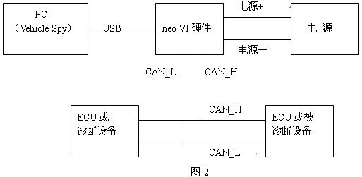 Vehicle Spy可以通過兩種方式監(jiān)控總線通信:通過車載的ODB接口監(jiān)控汽車總線通信(圖1)和直接監(jiān)控ECU之間的通信(包括診斷儀和被診斷設(shè)備,圖2)