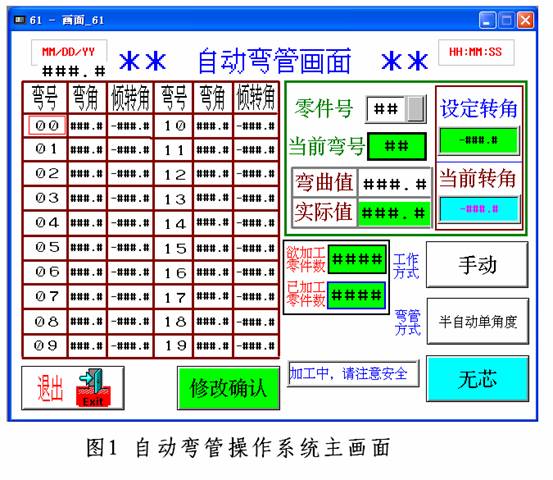 B、可存儲上百種產(chǎn)品型號,每種型號可設(shè)定20個彎管角度參數(shù)和20個旋轉(zhuǎn)角度參數(shù),可滿足多種復雜、多角度、不同空間的要求,并可對工作進度進行實時監(jiān)控顯示。如圖1所示;