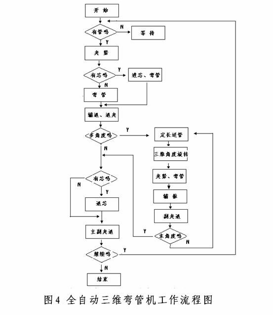 系統(tǒng)主要工作步驟有彎管主副夾夾緊、有芯進芯并計時、彎管、輔推彎管、慢彎進行、主副夾退夾、步進電機動作旋轉(zhuǎn)、退彎動作、退芯完成等。其主要工作流程如圖4所示。