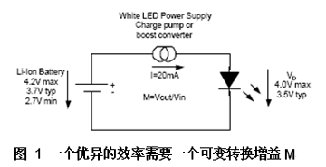 轉(zhuǎn)換增益為2的真正的倍壓充電泵具有非常低的效率(低至40%),且對便攜式設(shè)備沒有太大的吸引力;而具有組合轉(zhuǎn)換增益(增益為1.0和1.5)的充電泵則顯示出了更好的效果。這樣一款充電泵接下來的問題就是從增益M=1.0向M=1.5的轉(zhuǎn)換點轉(zhuǎn)換,這是因為發(fā)生增益轉(zhuǎn)換后效率將下降至60%的范圍。當電池可在大部分時間內(nèi)正常運行的地方發(fā)生效率下降(轉(zhuǎn)換)時,整體效率會降低。因此,在接近3.5V的低電池電壓處發(fā)生轉(zhuǎn)換時就可以實現(xiàn)高效率。但是,該轉(zhuǎn)換點取決于LED正向電壓、LED電流、充電泵I2R損耗以及電流感應(yīng)電路所需的壓降。這些參數(shù)將把轉(zhuǎn)換點移至更高的電池電壓。因此,在具體的系統(tǒng)中必須要對這樣一款充電泵進行精心評估,以實現(xiàn)高效率數(shù)值。 計算得出的效率數(shù)值顯示了充電泵解決方案最佳的理論值。在現(xiàn)實生活中,根據(jù)電流控制方法的不同會發(fā)生更多的損耗,其對效率有非常大的影響。除了I2R損耗以外,該器件中的開關(guān)損耗和靜態(tài)損耗也將進一步降低該充電泵解決方案的效率。 通過使用一款感應(yīng)升壓轉(zhuǎn)換器可以克服這些不足之處,該升壓轉(zhuǎn)換器具有一個可變轉(zhuǎn)換增益M,如方程式(7)和圖3所示。