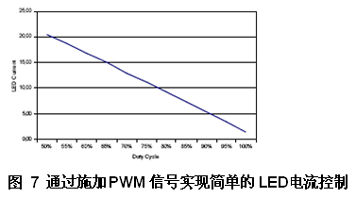 效率還取決于所選電感。在此應(yīng)用中,一個尺寸為1210的小型電感可以實現(xiàn)高達83%的效率,從而使總體解決方案尺寸可與一個需要兩個尺寸為0603的飛跨電容充電泵解決方案相媲美。 圖7顯示了LED電流作為控制LED亮度的PWM占空比的一個線性函數(shù)。