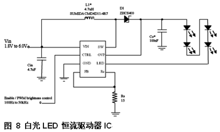 上述解決方案顯示了用于驅(qū)動白光LED的標準升壓轉(zhuǎn)換器的結(jié)構(gòu)以及通過限制PWM占空比范圍并選擇一個不同的電流控制反饋網(wǎng)絡(luò)來提高效率的可能性。按照邏輯思維,我們接下來將討論一款集成了所有這些特性的解決方案。 專用LED驅(qū)動器減少了外部組件數(shù)量 圖8顯示了一款集成了前面所述特性的器件。直接在CTRL引腳上施加一個PWM信號就可以對LED電流進行控制。