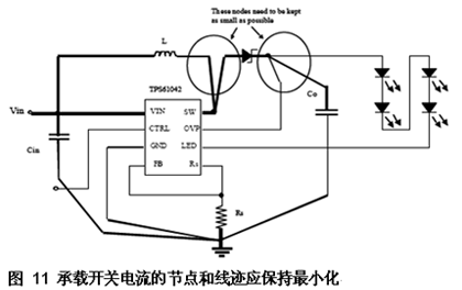 圖10顯示整個鋰離子電池電壓范圍(2.7V~4.2V)內(nèi)均可以實現(xiàn)80%以上的效率。在此應(yīng)用中,使用了一個高度僅為1.2mm的電感(Sumida CMD4D11-4R7,3.5mm*5.3mm*1.2mm)。 從圖10中的效率曲線可以看出:在大多數(shù)應(yīng)用中,升壓轉(zhuǎn)換器可以實現(xiàn)比充電泵解決方案更高的效率。但是,在無線應(yīng)用中使用升壓轉(zhuǎn)換器或充電泵時還需要考慮EMI問題。 對EMI加以控制 由于這兩款解決方案均為運行在高達1MHz轉(zhuǎn)換頻率上的開關(guān)轉(zhuǎn)換器,且可以快速的上升和下降,因此無論使用哪一種解決方案(充電泵還是升壓轉(zhuǎn)換器)都必須要特別謹慎。如果使用的是充電泵解決方案,則不需要使用電感,因此也就不存在磁場會引起EMI的問題了。但是,充電泵解決方案的飛跨電容通過在高頻率時開啟和關(guān)閉開關(guān)來持續(xù)地充電和放電。這將引起電流峰值和極快的上升,并對其他電路發(fā)生干擾。因此飛跨電容應(yīng)該盡可能地靠近IC連接,且線跡要非常短以最小化EMI放射。必須使用一個低ESR輸入電容以最小化高電流峰值(尤其是出現(xiàn)在輸入端的電流峰值)。 如果使用的是一款升壓轉(zhuǎn)換器,則屏蔽電感器將擁有一個更為有限的磁場,從而實現(xiàn)更好的EMI性能。應(yīng)對轉(zhuǎn)換器的轉(zhuǎn)換頻率加以選擇以最小化所有對該系統(tǒng)無線部分產(chǎn)生的干擾。PCB布局將對EMI產(chǎn)生重大影響,尤其要將承載開關(guān)或AC電流的線跡保持盡可能小以最小化EMI放射,如圖11所示。