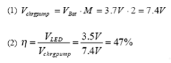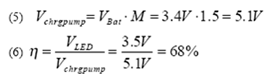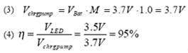 式中Vchrgpump為充電泵IC內(nèi)部產(chǎn)生的電壓,VBat為鋰離子電池的典型電池電壓。充電泵需要提供一個恒定的電流以及相當于LED3.5V典型正向電壓的輸出電壓。通常,固定轉(zhuǎn)換增益為2的充電泵會在內(nèi)部產(chǎn)生一個更高的電壓(1),該電壓將會導(dǎo)致一個降低整體系統(tǒng)效率的內(nèi)部壓降(2)。更為高級的充電泵解決方案通過在1.5和1轉(zhuǎn)換增益之間進行轉(zhuǎn)換克服了這一缺點。這樣就可以在電池電壓稍微高于LED電壓時實現(xiàn)在90%~95%效率級別之間運行,從而充許使用增益值為1的轉(zhuǎn)換增益。方程式(3)和方程式(4)顯示了這一性能改進。