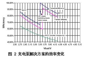圖2顯示了充電泵解決方案在不同轉(zhuǎn)換增益M條件下理論與實際效率曲線圖。