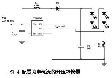 可變轉(zhuǎn)換增益可實現(xiàn)一個剛好與LED正向電壓相匹配的電壓,從而避免了內(nèi)部壓降,并實現(xiàn)了高達85%的效率。 可驅(qū)動4白光LED的標準升壓轉(zhuǎn)換器 圖4中的升壓轉(zhuǎn)換器被配置為一個可驅(qū)動4白光LED的電流源。該器件將檢測電阻器Rs兩端的電壓調(diào)節(jié)至1.233V,從而得到一個定義的LED電流。