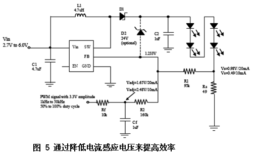 在圖5中,一個可選齊納二極管被添加到了電路中,用鉗位控制輸出電壓,以防止一個LED斷開連接或出現(xiàn)高阻抗。一個具有3.3V振幅的PWM信號被施加到該轉(zhuǎn)換器的反饋電路上,同時使用了一個低通濾波器Rf和Cf,以過濾PWM信號的DC部分并在R2處建立一個模擬電壓(Vadj)。通過改變所施加PWM信號的占空比,使該模擬電壓上升或下降,從而調(diào)節(jié)該轉(zhuǎn)換器的反饋電壓,此舉會增加或降低轉(zhuǎn)換器的LED電流。通過在R2處施加一個高于轉(zhuǎn)換器反饋電壓(1.233V)的模擬電壓,可以在檢測電阻器兩端實現(xiàn)一個更低的感應(yīng)電壓。對于一個20mALED電流而言,感應(yīng)電壓從1.233V下降到了0.98V(對于10mALED電流而言,甚至會降至0.49V)。 當使用一個具有3.3V振幅的PWM信號時,必須要將控制LED亮度的占空比范圍從50%調(diào)整到100%,以得到一個通常會高于1.233V反饋電壓的模擬電壓。在50%占空比時,模擬電壓將為1.65V,從而產(chǎn)生一個20mA、0.98V的感應(yīng)電壓。將占空比范圍限制在70%~100%之間會進一步降低感應(yīng)電壓。由此得出的效率曲線如圖6所示。