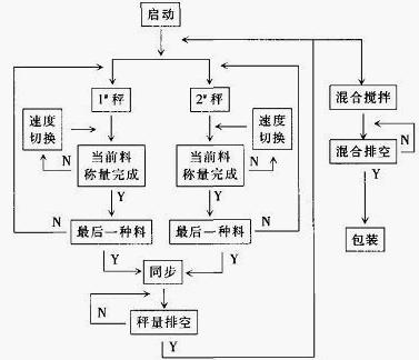 控制系統(tǒng)分手動(dòng)和自動(dòng)2種操作方式。在手動(dòng)方式操作下,主要完成粉刷石膏砂漿生產(chǎn)線的單機(jī)調(diào)試、故障維修、稱量模塊的標(biāo)定等功能。在自動(dòng)方式下,上位機(jī)HMI實(shí)現(xiàn)粉刷石膏砂漿配方的設(shè)定、原料稱量瞬時(shí)值和累計(jì)報(bào)表動(dòng)態(tài)顯示、生產(chǎn)線故障報(bào)警等功能。下位機(jī)PLC執(zhí)行粉刷石膏砂漿生產(chǎn)工藝配方值的工程轉(zhuǎn)換和精確實(shí)現(xiàn)每道工序的生產(chǎn)要求;變頻器高、中、低速切換,去皮和零位追蹤,超差處理,故障診斷等功能。同時(shí),由于在程序中加入了對(duì)生產(chǎn)狀況的預(yù)測(cè)控制和累計(jì)誤差補(bǔ)償?shù)人惴?,使得粉刷石膏砂漿的生產(chǎn)控制精度和穩(wěn)定性大大提高。SIWAREX系統(tǒng)在粉刷石膏砂漿生產(chǎn)中的工藝控制過程如圖1所示。