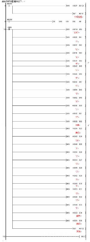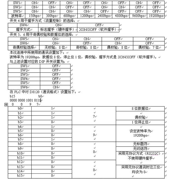 對(duì)象: ① FX2N PLC + FX2N-232-BD ② TPuP-A系列微型面板式打印機(jī)(uP-A16S) 在串口打印機(jī)的控制板上有一個(gè)DIP開(kāi)關(guān),用于對(duì)串行口的參數(shù)進(jìn)行設(shè)定。其中: 開(kāi)關(guān)1、2、3用于波特率的設(shè)定: 下面的PLC程序通過(guò)使用RS指令(FNC. 80)實(shí)現(xiàn)打印以下格式文字的功能(當(dāng)X0接通時(shí)): MITSUBISHI ELECTRIC 其中,利用ESC/P(EPSON打印標(biāo)準(zhǔn)代碼)指令生成一個(gè)空格。指令的格式為:ESC f m n 當(dāng)m=0時(shí),該指令將生成n個(gè)空格。 當(dāng)m=1時(shí),該指令將生成n行空行。 因此,要生成一個(gè)空格可以使用以下指令: ESC f 0 1 ![]() |