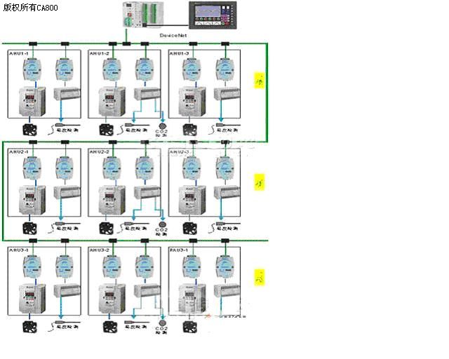 一,前沿 商場營業(yè)廳等大型公眾室內建筑空調新風系統(tǒng)為人群提供舒適健康購物環(huán)境,但同時也會消耗著大量的能源。如何有效地解決這個問題,就需將環(huán)境對人的影響進行分析。資料顯示,室內空調計算溫度與耗能量有直接的關系,因此通過合理的設定室內空調的運行參數(shù),既可以滿足人體對環(huán)境健康性要求的同時,又可以達到節(jié)能的目的,降低空調系統(tǒng)運行時間,節(jié)約費用。其中二氧化碳CO2是衡量空氣質量的重要指標,為了在節(jié)能的同時提供適宜空氣環(huán)境,需對CO2進行監(jiān)測與調節(jié)。本文以某3層商場中央空調系統(tǒng)作為設計案例。 商場中央空調系統(tǒng)主要負責賣場樓層的冷暖供給,其中下層主要為商鋪和車庫,其它樓層為賣場區(qū)域。因賣場商品分區(qū)擺放,各區(qū)域功能不同,造成人流密度分布不均,導致各區(qū)域溫度與CO2 濃度差異,同時考慮到超市空調為懸掛式安裝,冷(暖)風分區(qū)供給、就地回風,所以本系統(tǒng)采用通過DeviceNet現(xiàn)場總線網絡進行區(qū)域控制、局部微調、集中管理的控制策略。商場的特點是不同時間、不同時段人流量差異較大,溫度以及CO2 濃度也伴隨人流量的變化而變化,如人流量在周末、節(jié)假日增多,溫度、CO2 濃度也相對較高,平時相對較少。項目設計要求控制系統(tǒng)根據(jù)現(xiàn)場環(huán)境對溫度、CO2 濃度自動調節(jié)。