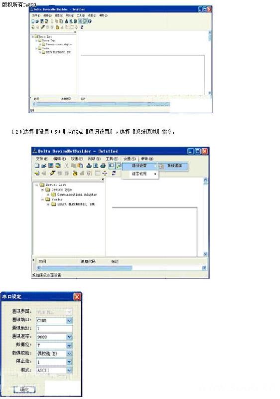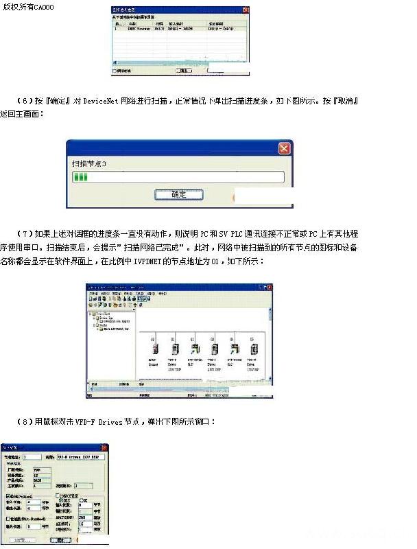 3.1 DeviceNet從站配置 (1)打開DeviceNetBuilder軟件,軟件界面如下所示。 (3)在此對計算機與 SV 主機的通訊參數(shù)進行設置。如”通訊端口”、”通訊地址”、”通訊速率”、”通訊格式”。設置正確后,點擊『確定』按鈕,返回主界面。 (4)選擇『網絡(N)』菜單點『在線』指令。 (5)彈出下所示窗口: