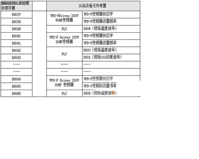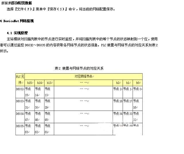 當掃描列表中的節(jié)點正常時,相應的位為OFF狀態(tài),當掃描列表中的節(jié)點發(fā)生異常時,相應的位為ON狀態(tài)。用戶通過監(jiān)控D6036的內容實時獲取主站模塊的狀態(tài)信息。當主站模塊正常工作時,D6036的內容為0;當主站模塊處于初始化時,D6036高字節(jié)內容為1,低字節(jié)內容為0;當主站模塊發(fā)生錯誤時,D6036高字節(jié)內容為2,錯誤的詳細信息參考D6036低字節(jié)的錯誤代碼 :