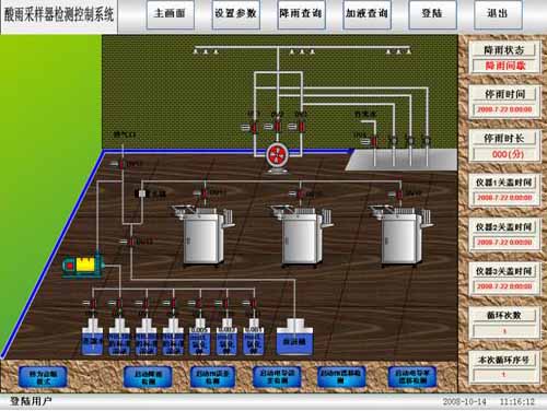 1、 畫面監(jiān)控:實現(xiàn)對降雨和自動添加試劑系統(tǒng)的監(jiān)控,模擬大、中、小三種降雨狀態(tài),實現(xiàn)雨水循環(huán)系統(tǒng),模擬三臺被檢儀器的開關(guān)蓋狀態(tài)等。