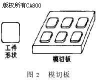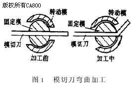 模切刀是高23 8mm、厚0 71mm的條狀單刃刀片,常見(jiàn)規(guī)格為長(zhǎng)1m的直刀或100m的盤刀,其平面圖形等同于展開(kāi)的加工件圖形邊界。數(shù)控彎刀機(jī)主要由數(shù)控系統(tǒng)、進(jìn)給機(jī)構(gòu)、旋轉(zhuǎn)機(jī)構(gòu)和彎刀嘴組成。彎刀嘴分為固定模和轉(zhuǎn)動(dòng)模。在模切刀加工過(guò)程中(如圖1所示),進(jìn)給機(jī)構(gòu)將刀片送進(jìn)彎刀嘴固定模,固定模緊緊握住刀片,旋轉(zhuǎn)機(jī)構(gòu)驅(qū)動(dòng)轉(zhuǎn)動(dòng)模將刀片精確地折彎,這樣反復(fù)工作,完成預(yù)定形狀。模切刀鑲嵌在母板(木質(zhì)或塑質(zhì)、金屬等)上,即為模切板(如圖2所示)。將模切板安裝在專用設(shè)備上,可以實(shí)現(xiàn)大開(kāi)張的包裝印刷材料一次沖切成形。