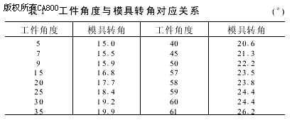 折角是模切刀折彎加工過(guò)程中的主要參數(shù)。轉(zhuǎn)動(dòng)模旋轉(zhuǎn)的角度(以下稱模具轉(zhuǎn)角)與模切刀折角(以下稱工件角度)不是線性關(guān)系,由于模切刀材料具有一定的彈性變形,數(shù)控編程角度(模具轉(zhuǎn)角)與工件角度之間是不相等的,需要進(jìn)行角度補(bǔ)償。在編程之前,需要根據(jù)不同的模切刀材料做相應(yīng)的試驗(yàn),得出工件角度與模具轉(zhuǎn)角之間的對(duì)應(yīng)關(guān)系表1是試驗(yàn)得出的一組數(shù)據(jù)。在實(shí)際計(jì)算時(shí),根據(jù)工件角度變化范圍和試驗(yàn)確定的工件角度與模具轉(zhuǎn)角之間的對(duì)應(yīng)關(guān)系,利用插值法求出數(shù)控編程角。