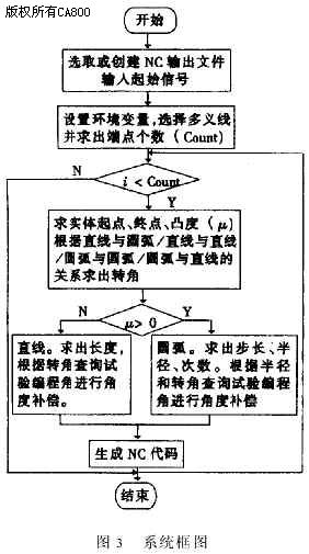 基于AutoCAD平臺(tái),系統(tǒng)設(shè)計(jì)的基本思路是:1)在AutoCAD中繪圖,編輯成多義線。2)圖形信息提取。3)求出端點(diǎn)總數(shù),開(kāi)始循環(huán)計(jì)算。4)求實(shí)體起點(diǎn)、終點(diǎn)、凸起,根據(jù)直線與圓弧、直線與直線、圓弧與圓弧、圓弧與直線的關(guān)系求出轉(zhuǎn)角。5)根據(jù)圓弧、直線參數(shù)的不同進(jìn)行加工角度補(bǔ)償。6)代碼轉(zhuǎn)換。7)程序輸出。系統(tǒng)框圖如圖3所示。
