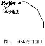 如果當(dāng)前實(shí)體是直線,直接送進(jìn)該直線段的長(zhǎng)度,根據(jù)工件角度自動(dòng)查詢表1得出模具轉(zhuǎn)角,利用插值法求出相應(yīng)的編程角。例如,當(dāng)工件角度γ大于15 0°小于等于20 0°時(shí),其編程角計(jì)算公式為:β=16 8+0 14(γ-15 0)。