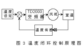在該系統(tǒng)中,冷凍泵、冷卻泵、水塔風(fēng)扇變頻器采用開環(huán)控制,由維護(hù)人員根據(jù)季節(jié)不同和負(fù)荷的變化進(jìn)行調(diào)節(jié);風(fēng)機(jī)采用溫度閉環(huán)控制,可根據(jù)溫度傳感器的反饋值,調(diào)節(jié)風(fēng)機(jī)的轉(zhuǎn)速,從而使被控環(huán)境溫度基本保持恒定。原理圖如下所示: