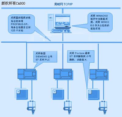 采用德國西門子公司的S7系列PLC作為機(jī)電一體化機(jī)組的現(xiàn)場控制設(shè)備,通過智能通訊模塊與中央數(shù)據(jù)采集的PROFIBUS總線相連,中央數(shù)據(jù)采集由德國西門子公司最新推出的基于PC的自動(dòng)化產(chǎn)品WINAC 4.0承擔(dān),該產(chǎn)品可以結(jié)合PCI插槽的CP5613卡實(shí)現(xiàn)4條PROFIBUS總線下最大500個(gè)PROFIBUS從站(125×4)的網(wǎng)絡(luò)連接,上位機(jī)的監(jiān)控軟件則采用西門子公司在自動(dòng)化領(lǐng)域最先進(jìn)技術(shù)與微軟公司共同開發(fā)的處于世界領(lǐng)先地位的組態(tài)軟件WINCC 6.0。而在觸摸屏部分,選用了在HMI市場處于領(lǐng)先地位的Pro-face公司最新推出的小型觸摸屏ST系列。系統(tǒng)結(jié)構(gòu)參見圖1: