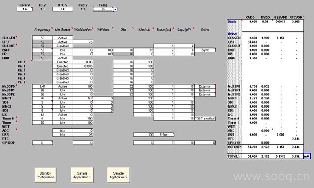 圖2是一個(gè)功率估算電子數(shù)據(jù)表,它把一個(gè)典型的DSP分解為若干個(gè)子系統(tǒng),由用戶輸入相關(guān)參數(shù),然后可以返回設(shè)備的功率估算值。就像這個(gè)電子數(shù)據(jù)表所顯示的,估算是否正確取決于用戶提供的信息是否反映出對(duì)系統(tǒng)使用方式的良好了解,包括數(shù)據(jù)寬度、頻率、電源電壓和使用中外設(shè)的可用帶寬的百分比等因素。
