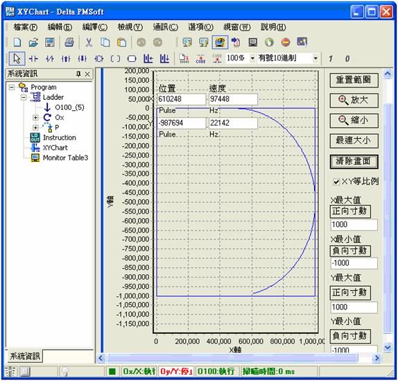 由于20PM主機結(jié)合了PLC順序邏輯控制及雙軸插補定位控制的功能,因此在程序架構(gòu)上主要分為O100主程序、Ox運動子程序及Pn子程序等三大類,結(jié)合了基本指令、應用指令、運動指令及G Code指令,使程序設(shè)計更多元化,結(jié)構(gòu)更清晰;程序采用PMSOFT軟件進行編輯,參見圖4。