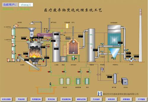 1. 項(xiàng)目簡(jiǎn)單工藝主要針對(duì)城市醫(yī)療垃圾進(jìn)行處理,醫(yī)療垃圾收運(yùn)后運(yùn)到處置中心進(jìn)行焚燒處理,垃圾首先進(jìn)入焚燒爐和二燃室進(jìn)行配風(fēng)焚燒,焚燒后的煙氣通過(guò)鍋爐進(jìn)行降溫、除酸噴霧塔和布袋除塵器進(jìn)行除酸和除塵,然后通過(guò)35米煙囪直接排放;鍋爐產(chǎn)生的蒸汽用于發(fā)電或其它用途,本自控系統(tǒng)主要控制垃圾燃燒后產(chǎn)生的煙氣溫度和煙氣成本含量,保證減少二次污染。