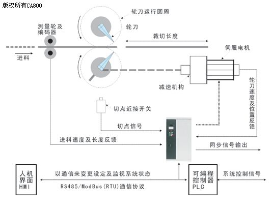 下圖為電腦螺旋刀橫切機(jī)控制簡(jiǎn)圖。此系統(tǒng)實(shí)現(xiàn)旋轉(zhuǎn)式同步動(dòng)態(tài)裁切,上下兩組裁切輪刀同時(shí)被伺服馬達(dá)帶動(dòng),各依箭頭所示方向相對(duì)旋轉(zhuǎn)。輪刀之上的刀刃必須作精密的調(diào)整,當(dāng)上輪刀之刀刃旋轉(zhuǎn)至正下方時(shí),下刀刃恰好轉(zhuǎn)至正上方,才能執(zhí)行正確的裁切。每次裁切刀輪旋轉(zhuǎn)一圈,便自動(dòng)將材料切斷一次;馬達(dá)只要在相同方向連續(xù)運(yùn)轉(zhuǎn),輪刀便能連續(xù)裁切。
