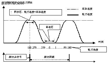 4. 當(dāng)進(jìn)料長(zhǎng)度累計(jì)到適當(dāng)長(zhǎng)度時(shí),裁切刀輪開(kāi)始朝進(jìn)料速度目標(biāo)加速;而且裁刀速度曲線經(jīng)過(guò)控制系統(tǒng)精確的計(jì)算、控制,務(wù)求在裁刀速度上升到與進(jìn)料速度同步的同時(shí),裁切刀輪也恰好進(jìn)入同步區(qū)域。