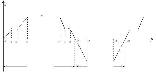 圖中表示了銑床工作臺(tái)工作銑削行程和返回過(guò)程的變化。0~t1銑床工作臺(tái)空行程起動(dòng);t1~ t2銑床工作臺(tái)以穩(wěn)定速度n1運(yùn)轉(zhuǎn);t2~ t3銑床工作臺(tái)帶銑削負(fù)載加速;t3~ t4銑床工作臺(tái)以穩(wěn)定速度n2運(yùn)轉(zhuǎn);t4~ t5銑床工作臺(tái)減速;t5~ t6銑床工作臺(tái)保持n3速度條件下刀具離開(kāi)工件;t6~ t7銑床工作臺(tái)減速到零;t7~ t10銑床工作臺(tái)反向加速到高速運(yùn)轉(zhuǎn)制動(dòng)后返回原加工位置,由此在重復(fù)上面所述的銑削循環(huán)。