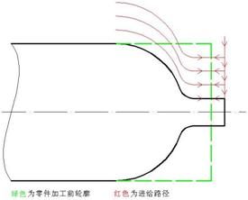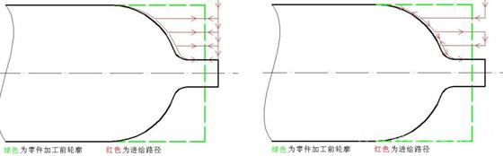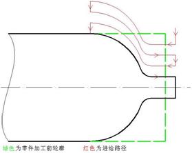 (1)軌跡設(shè)計(jì)。第一種自動(dòng)化旋壓加工軌跡如圖3所示。第二種自動(dòng)化旋壓加工軌跡如圖4所示。采用第一種進(jìn)給方式優(yōu)點(diǎn)是編程簡(jiǎn)單,工件表面光潔度好,但是容易導(dǎo)致工件變粗或拉斷,因此采用第二種進(jìn)給方式。