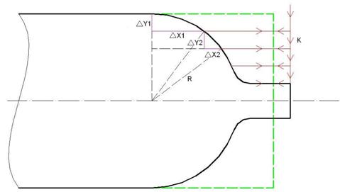 第一段圓弧在X方向長(zhǎng)度ΔX1=sqrt(R2-(R-K)2)