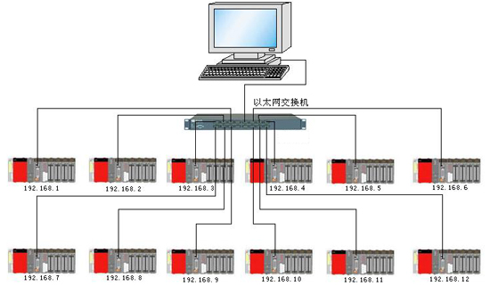 該系統(tǒng)的特點是使用的模塊很多,要向上位機傳輸?shù)臄?shù)據(jù)也非常多,12套PLC中每一套PLC就要傳輸30個溫度測量值和15個溫度平均值,還有PID參數(shù)以及許多開關(guān)量和報警信號等等,為了滿足大量數(shù)據(jù)的高速傳輸,我們采用了100M以太網(wǎng)進行通訊,不但能滿足系統(tǒng)對監(jiān)控的實時性要求,還大大減少了系統(tǒng)配置和布線的麻煩。