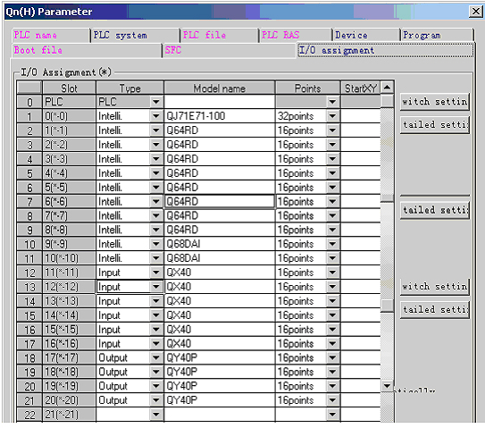 該系統(tǒng)使用了三菱的Q02CPU,智能功能模塊Q64RD、Q68DAI,I/O模塊QX40、QY40P和通訊模塊QJ71E71-100,系統(tǒng)硬件I/O分配圖如下圖: