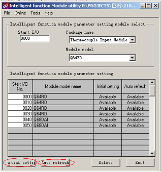(1)對各個智能功能模塊要進行初始化設(shè)置,使用實用程序包對各個智能功能模塊的參數(shù)進行設(shè)置,可以免去編寫梯形圖的麻煩。一共有兩項設(shè)置:初始化參數(shù)設(shè)置和自動刷新設(shè)置,如下圖