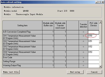 (2)對于Q68DAI模塊,為8通道模擬量輸出,使用時必須要把數(shù)模轉(zhuǎn)換允許標(biāo)志Y0~Y8置“1”才能正常進行數(shù)模轉(zhuǎn)換。在智能功能模塊參數(shù)設(shè)置好以后,發(fā)現(xiàn)有一個Q64RD模塊出錯,經(jīng)檢查,原因是自動刷新里設(shè)置的數(shù)據(jù)寄存器D50,在梯形圖程序中使用到,產(chǎn)生地址沖突,改正過來后問題得到解決。