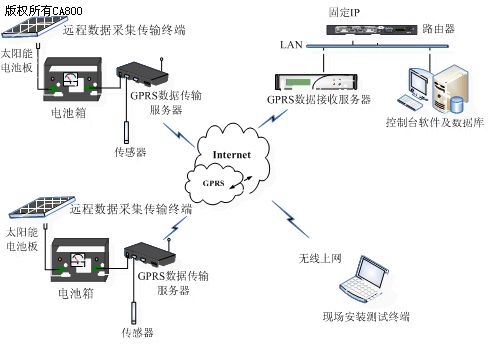 遠端監(jiān)測點又由三個部分構成:數(shù)據(jù)采集器、GPRS數(shù)據(jù)傳輸器及數(shù)據(jù)傳輸設備電源。數(shù)據(jù)采集器:我們采用傳感器對地下水的水位進行監(jiān)測;GPRS數(shù)據(jù)傳輸設備可以將所采集的數(shù)據(jù)按照用戶設定的上傳時間間隔上傳而數(shù)據(jù)傳輸設備電源采用太陽能供電方式,適合工作于野外無人值守的環(huán)境中。
