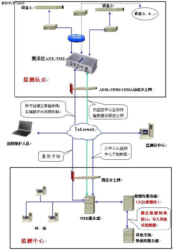 研華ARK-3381產(chǎn)品作為監(jiān)測站點(diǎn)的上位機(jī),通過RS-232或RS-485串口與下端各種儀器儀表通訊連接,把儀器儀表采集上來的數(shù)據(jù)保存在本地硬盤上,并根據(jù)所設(shè)定的時(shí)間段,或者實(shí)時(shí)通過LAN口(電信寬帶)傳輸數(shù)據(jù)到監(jiān)測中心服務(wù)器。