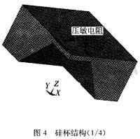 其中,壓阻式壓力傳感器主要是利用半導(dǎo)體的壓阻效應(yīng),把一個惠斯通電橋做在一個硅杯上,如圖4所示。當(dāng)硅杯受到壓力后發(fā)生形變,惠斯通電橋的四個橋臂電阻就會發(fā)生變化,打破了電橋的電平衡,從而會有一個電信號的輸出。