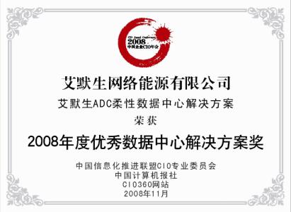 艾默生網(wǎng)絡(luò)能源獲“2008年度優(yōu)秀數(shù)據(jù)中心解決方案獎”