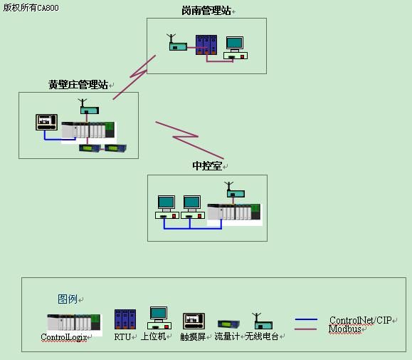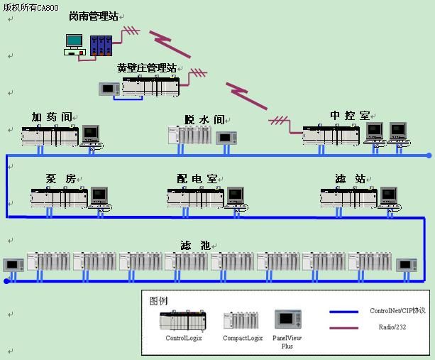 根據(jù)水廠生產(chǎn)工藝及管理要求,在系統(tǒng)設(shè)計(jì)時(shí)以原系統(tǒng)的站點(diǎn)結(jié)構(gòu)為依據(jù),保留原有的6個(gè)主站、9個(gè)子站。6個(gè)主站采用ControlLogix系列PLC;9個(gè)子站采用CompactLogix系列PLC,廠區(qū)內(nèi)主干網(wǎng)以及主站與子站之間均采用ControlNet冗余網(wǎng)絡(luò),上位機(jī)及觸摸屏均掛在ControlNet冗余網(wǎng)絡(luò)上。為保證信號(hào)的穩(wěn)定和介質(zhì)的抗干擾性,在伴有高電壓及大電流的區(qū)段選用光纖作為網(wǎng)絡(luò)介質(zhì)。廠區(qū)中控室與崗南取水管理站和黃壁莊取水管理站數(shù)據(jù)傳輸采用無(wú)線通訊的方式實(shí)現(xiàn)。