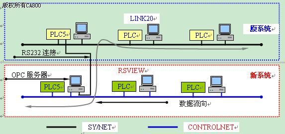 新舊系統(tǒng)的兼容是暫時(shí)行為,在總體投資上不應(yīng)該過(guò)分加大,因此我們選用比較經(jīng)濟(jì)的軟件兼容方式,即使用第三方的OPC服務(wù)器作為兩個(gè)系統(tǒng)數(shù)據(jù)交換的橋梁。新自控系統(tǒng)將已改造站點(diǎn)的數(shù)據(jù)按照原系統(tǒng)的數(shù)據(jù)格式寫入原自控系統(tǒng),從而保證原自控系統(tǒng)的顯示完整。為了完成這一目的,新自控系統(tǒng)增加OPC服務(wù)器,同時(shí)原自控系統(tǒng)內(nèi)的PLC程序?qū)⒆霰匾母膭?dòng)以適應(yīng)這種運(yùn)行模式。