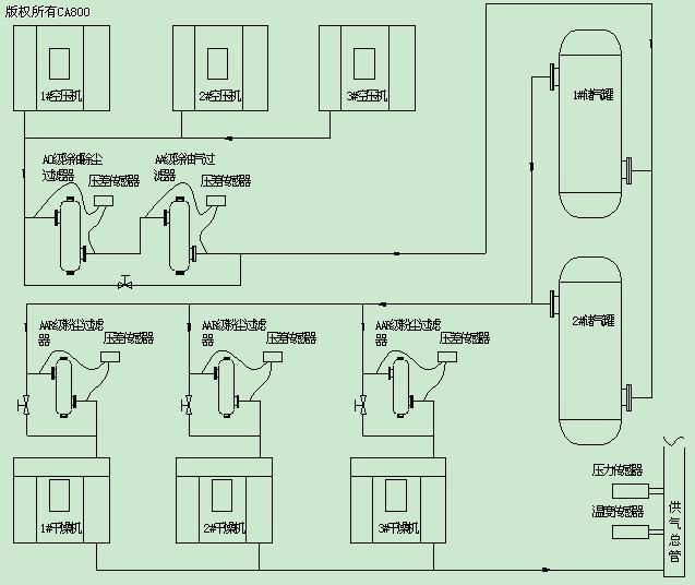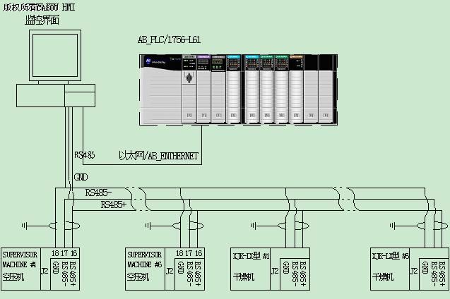 為企業(yè)生產(chǎn)線提供合格的壓縮空氣,組建足夠容量的壓縮空氣生產(chǎn)線,建立和健全的監(jiān)控系統(tǒng)、設(shè)備維護(hù)系統(tǒng),提高自動(dòng)化程度,是提高生產(chǎn)效率、降低成本行之有效的途徑。本系統(tǒng)是以美國(guó)壽力公司的水冷型螺桿式空壓機(jī)300-2S型及漢粵組合式水冷干燥機(jī)組、冷卻機(jī)組等構(gòu)建的空氣壓縮站系統(tǒng)為控制對(duì)象,設(shè)計(jì)一種基于多總線協(xié)議(含多種不規(guī)則RS485協(xié)議)傳輸控制的可靠、高效的控制系統(tǒng),精簡(jiǎn)了組建時(shí)的現(xiàn)場(chǎng)材料與工作量,確保了產(chǎn)能平衡;系統(tǒng)采用PLC執(zhí)行控制,同時(shí)在上位機(jī)進(jìn)行實(shí)時(shí)監(jiān)控壓縮空氣及其生產(chǎn)設(shè)備的狀況與運(yùn)行。