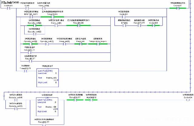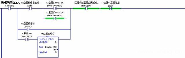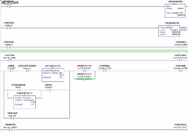 以上三點(diǎn)為本系統(tǒng)主要的邏輯核心,其余,諸如冷卻系統(tǒng)、氣路閥等相關(guān)聯(lián)的聯(lián)鎖保護(hù)、控制,以及生產(chǎn)過(guò)程各個(gè)模擬量信號(hào)的采集、分析、處理等,遵循功能規(guī)劃設(shè)計(jì)及組態(tài)軟件常規(guī)應(yīng)用技術(shù),得以實(shí)現(xiàn)和完善系統(tǒng)??諌簷C(jī)部分邏輯控制功能程序如圖5所示。