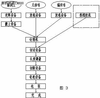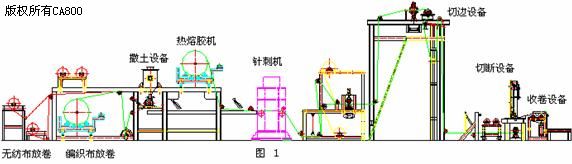 潤土送到撒土設(shè)備;然后,撒土設(shè)備將膨潤土均勻撒在編織布上以后覆蓋無紡布再經(jīng)過針刺機(jī)以不同頻率進(jìn)行針刺,切邊設(shè)備再將其左右兩邊進(jìn)行修整,使產(chǎn)品更加整齊美觀;最后,由長度測量系統(tǒng)控制每一卷長度,切斷后收卷、包裝即完成了一卷膨潤土防水毯的生產(chǎn)。其中,熱熔膠機(jī)只在生產(chǎn)帶膜產(chǎn)品時投入使用。