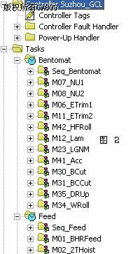 其中,我們將整條生產(chǎn)線程序命名為Controler Suzhou_GCL,然后將我們在程序中要使用的變量,以及PLC輸入和輸出點在控制器變量Controller Tags里定義,為了方便記憶,我們可以根據(jù)現(xiàn)實中的功能定義為別名(Alias Name),如產(chǎn)品實時長度我們可以定義為Current_Length。在控制器故障處理Controller Fault Handler中,我們要編寫程序?qū)刂破鞴收蠒r,PLC需做出的動作。同樣,在電源出現(xiàn)異常時,PLC需做出的動作也需要在上電處理Power-Up Handler中編程。