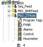 在編制此程序時,根據(jù)生產(chǎn)工藝流程(見圖3)在任務(wù)Tasks下建立了GCL生產(chǎn)線主工藝Bentomat、送料Feed等周期性任務(wù)與主任務(wù)Main Task共同完成整條生產(chǎn)線的自動控制。在主 任務(wù)Main Task中編寫生產(chǎn)線啟動、停止和子程序調(diào)用指令。然后我們按生產(chǎn)工藝流程將各種電動機(jī)分類到周期性任務(wù)里,在每一個周期性任務(wù)中細(xì)化程序。如在圖2中,首先在GCL生產(chǎn)線主工藝Bentomat中建立順序控制程序Seq_Bentomat;然后,編寫此任務(wù)中所有電動機(jī)程序(控制及各種信息),包括兩個無紡布放卷電動機(jī)M07_NU1和M08_NU2;兩個切邊電動機(jī)M06_ETrim1和M11_ETrim2;撒土電動機(jī)M42_HFRoll;加緊產(chǎn)品電動機(jī)M12_Lam;擺動桿驅(qū)動電動機(jī)M23_LGNM;加速滾筒驅(qū)動電動機(jī)M41_Acc;切斷刀片驅(qū)動電動機(jī)M30_BCut;切斷刀橫向行使驅(qū)動電動機(jī)M31_BCCut;提升滾筒驅(qū)動電動機(jī)M35_DRUp;收卷電動機(jī)M34_WRoll。每臺電動機(jī)分別包括變頻器通 訊程序FVNR、報警程序Alarms、控制程序Control、電動機(jī)運行時間統(tǒng)計程序Hourmeter等等,這樣使得程序系統(tǒng)性、可讀性大大增強,方便程序變更和改進(jìn)。例如,圖4中為2噸行車電動機(jī)編制控制程序,因為它是送料設(shè)備,我們將其分類到周期性任務(wù)Feed中,命名為M02_2THoist,并在其中建立其功能程序和梯形圖程序。